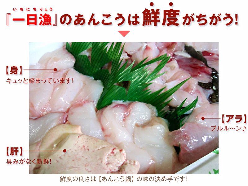 『一日漁』(いちにちりょう)の大きな【あんこう】の【身】・【アラ】・【肝】に「あんこう鍋のタレ」が付いたセットです。