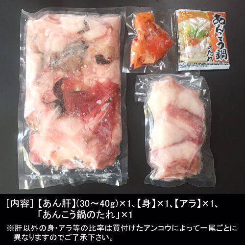 【あんこうの切り身(約860g)】 アラ真空パック×1、身真空パック×1、肝真空パック×3 【あんこう鍋のたれ(希釈用)】 80g |