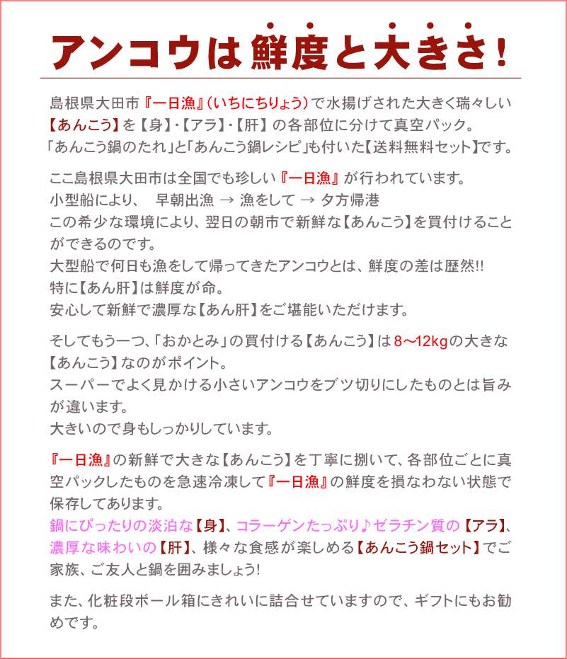 『一日漁』(いちにちりょう)の大きな【あんこう】の【身】・【アラ】・【肝】に「あんこう鍋のタレ」が付いた【送料無料セット】です。