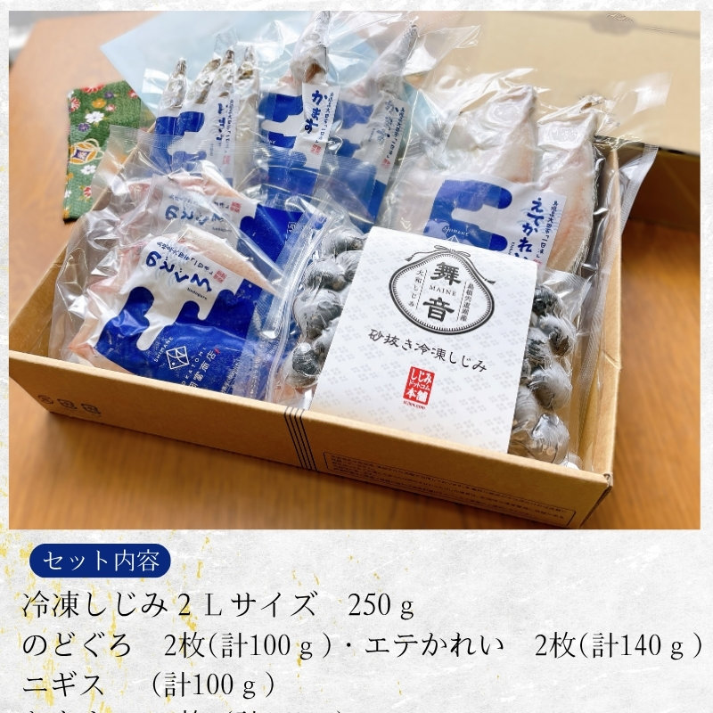 ・冷凍しじみ(250g) ・のどぐろ2枚(計100g) ・エテかれい2枚(計140g) ・かます2~3枚(計160g) ・ニギス(計100g) |