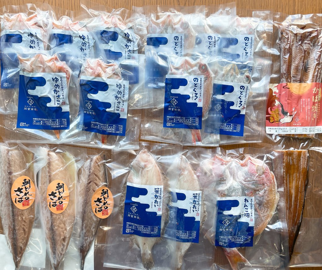 【セット内容】 ・のどぐろ一夜干 少サイズ5枚 ・ゆめかさご一夜干 小サイズ5枚 ・笹かれい一夜干 2枚 ・れんこ鯛一夜干 1枚(サイズの小さいものが2枚入る場合があります) ・さば一夜干 3枚 ・天女の羽衣~あなご蒲焼 1枚 |